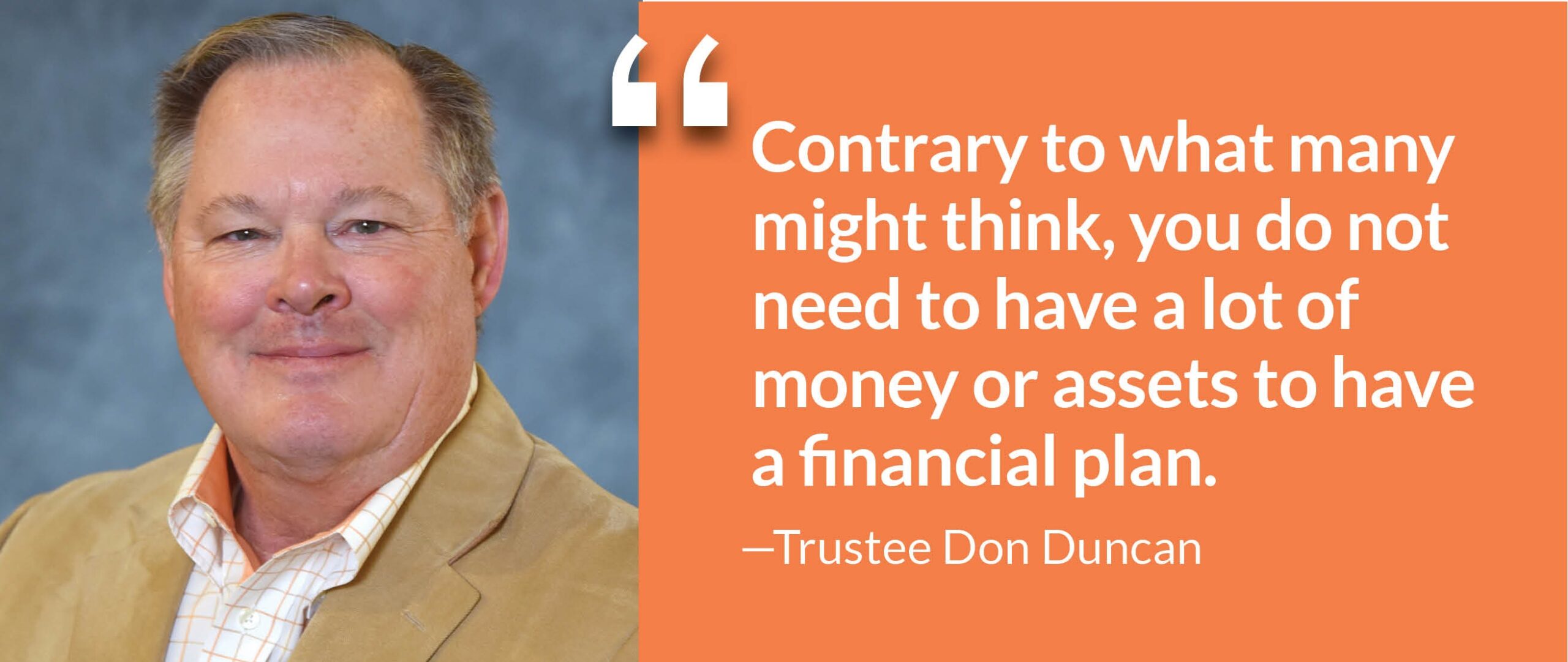 Trustee Don Duncan in a portrait, with a quote: 'Contrary to what many might think, you do not need to have a lot of money or assets to have a financial plan.'