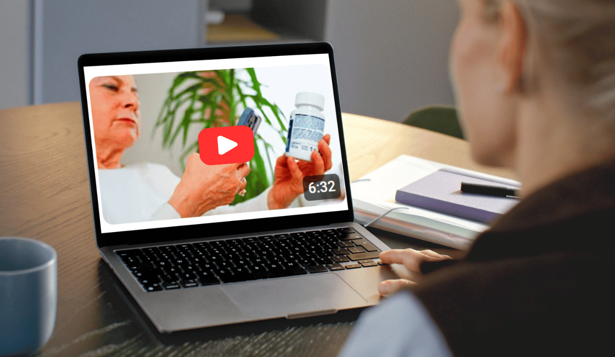 A woman watches a laptop screen with a youtube video showing assistive technology.