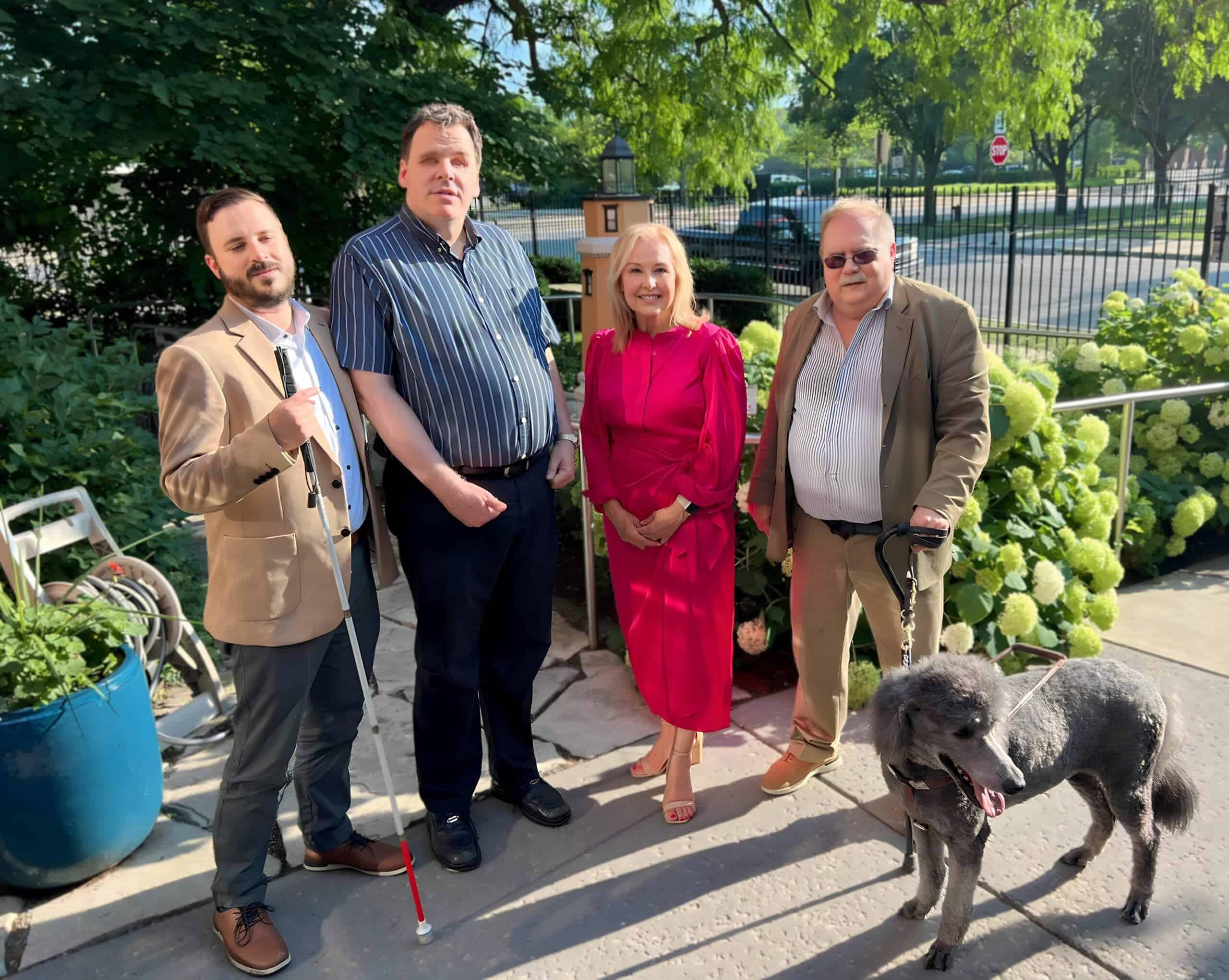 Greg and Turner stand with Lighthouse president and CEO Dr. Janet Szlyk, Ray C, and Peter T, who is holding a white cane. They are outside near a fence and greenery on a sunny day.